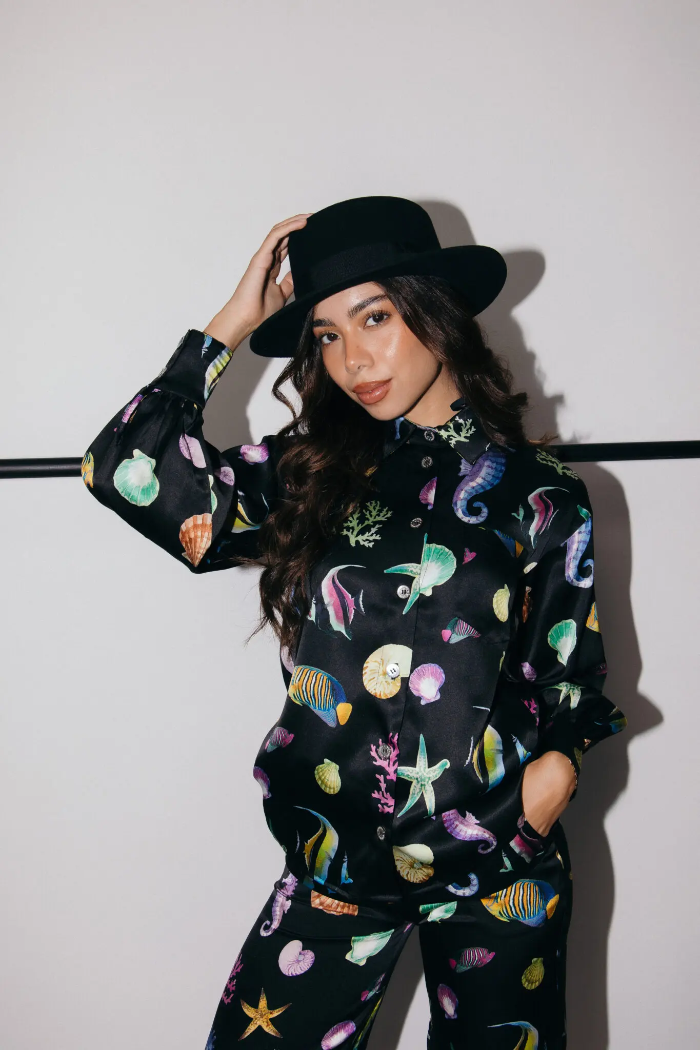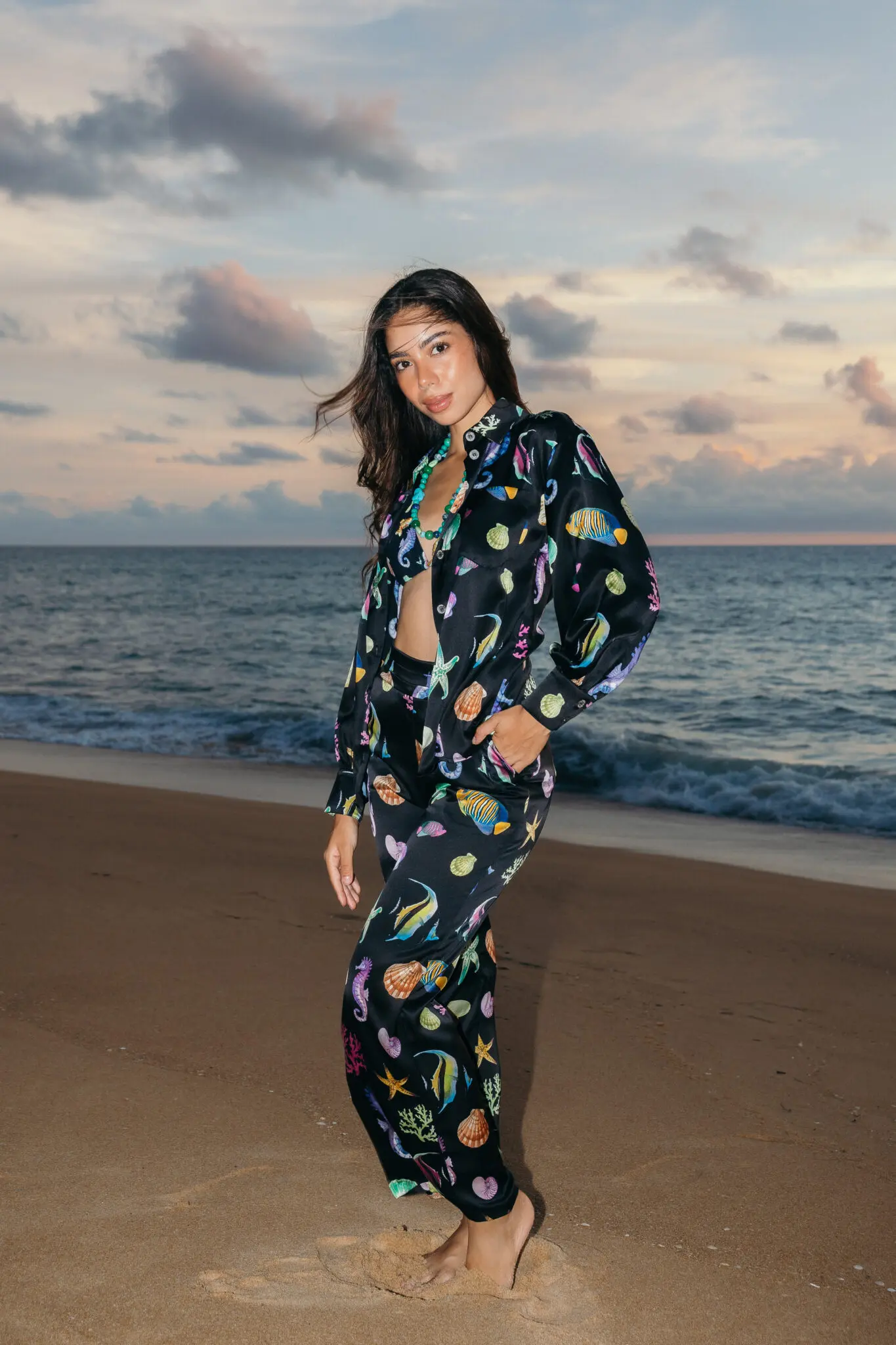 Our silk button down shirt in our colourway Pearl Sea is perfect for your next holiday retreat to soak in the sun and add elegance to your wardrobe. Featuring our Marine print of colourful corals, shells, and tropical fish for a fun and youthful beach look. Matching shorts and swimwear are also available to complete the look.